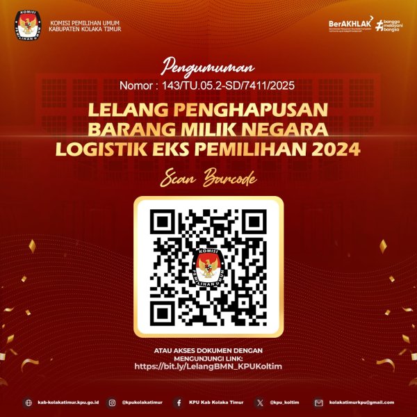 Scan barcode pada gambar atau akses dokumen dengan mengunjungi link berikut: https://bit.ly/LelangBMN_KPUKoltim