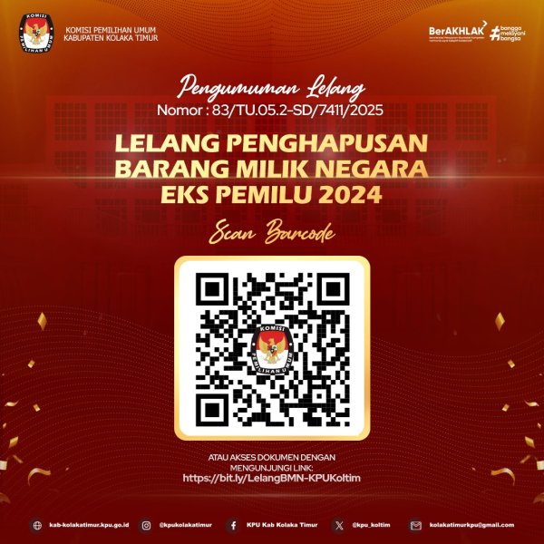 #TemanPemilih, berikut Pengumuman Lelang Nomor 83/TU.95.2-SD/7411/2025 Lelang Penghapusan Barang Milik Negara Eks Pemilu 2024. Scan barcode pada gambar atau akses dokumen dengan mengunjungi link berikut: https://bit.ly/LelangBMN-KPUKoltim