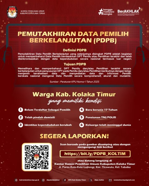 #TemanPemilih, Simak infografis tentang Pemutakhiran Data Pemilih Berkelanjutan (PDPB) berikut dan bagi Warga Kab. Kolaka Timur yang memiliki kondisi seperti pada gambar segera laporkan melalui barcode atau dengan mengunjungi link berikut : https://bit.ly/PDPB_KOLTIM