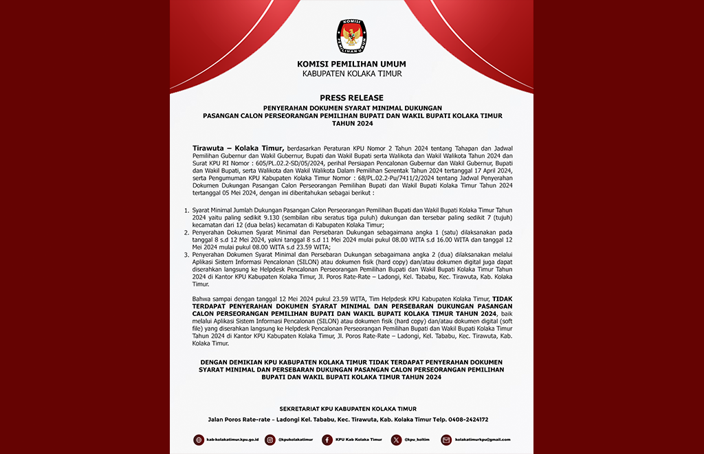 #TemanPemilih, KPU Kolaka Timur melaksanakan Konferensi Pers Pasca pelaksanaan Pemungutan dan Penghitungan Suara di TPS dan Persiapan Pelaksanaan Rekapitulasi Hasil Penghitungan Perolehan Suara Tingkat Kabupaten pada Pilkada Tahun 2024 di Kab. Kolaka Timur Hari Jumat tanggal 29 November 2024. Dengan rincian sebagai berikut: