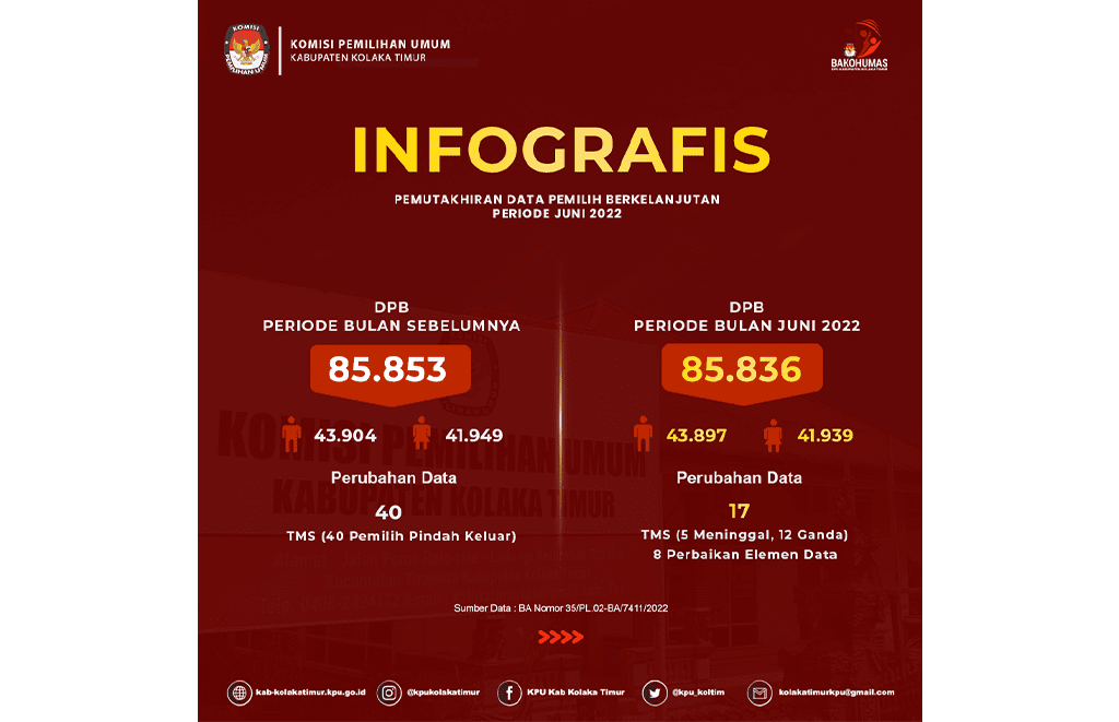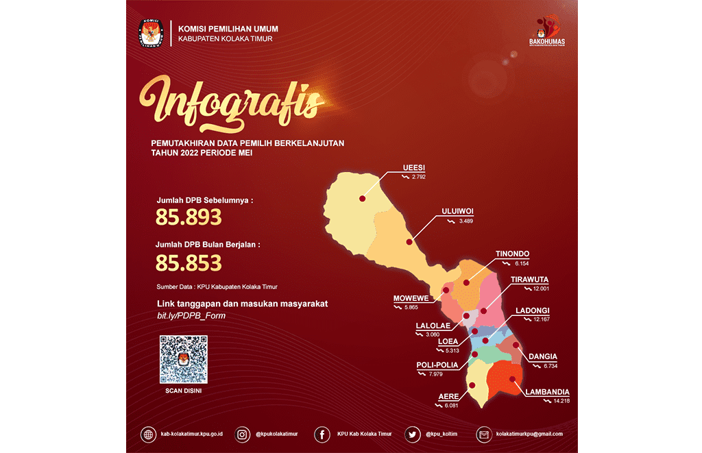 KPU Kabupaten Kolaka Timur menerima tanggapan dan masukan terhadap Data Pemilih dalam pelaksanaan Pemutakhiran Data Pemilih Berkelanjutan Tahun 2022 yang dapat disampaikan di kantor KPU Kabupaten Kolaka Timur atau melalui link : bit.ly/PDPB_Form dan scan barcode sebagaimana terlampir. (AHM)
