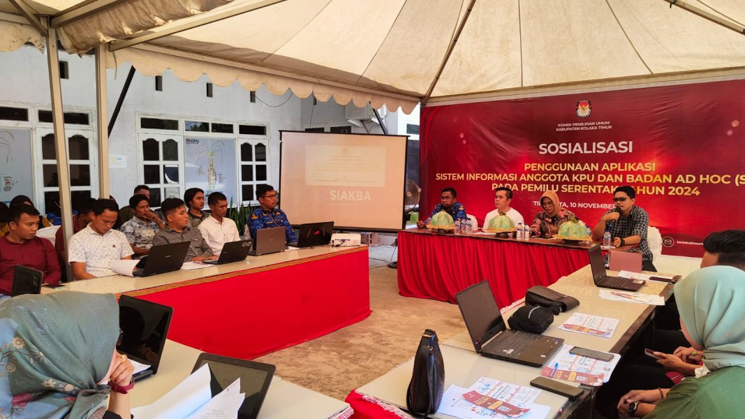 Tirawuta,kab-kolakatimur.kpu.go.id,- Menjelang pelaksanaan Pemilihan Umum Tahun 2024 Komisi Pemilihan Umum (KPU) Kabupaten Kolaka Timur melaksanakan Sosialisasi Penggunaan aplikasi Sistem Informasi Anggota KPU dan Badan Adhoc (SIAKBA) dalam rangka perekrutan badan Ad-Hoc Pemilu Serentak Tahun 2024 yang bertempat di kantor KPU Kabupaten Kolaka Timur pada tanggal 10 November 2022, Kegiatan ini dipimpin langsung oleh Ketua Suprihaty Prawaty Nengtias, Anggota Ashari Malaka, Murhum Halik, Sekretaris Hajon bersama Operator SIAKBA dengan mengundang peserta yang terdiri dari unsur Pemerintah, Organisasi kemasyarakatan,Tokoh Masyarakat.